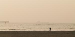 Hazy skies overlook an embracing couple at Cijin Beach, off the coast of Kaohsiung.