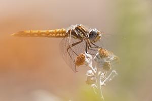 This view of a variegated meadowhawk taken during an extended hunting session features abstract colors of nearby flowers.