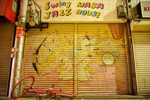 The toppled bike caught my eye before the Pokemon-esque pickup band on the security door. Then, I saw the name of the venue. Osaka offers myriad juxtapositions that off one’s kilter.